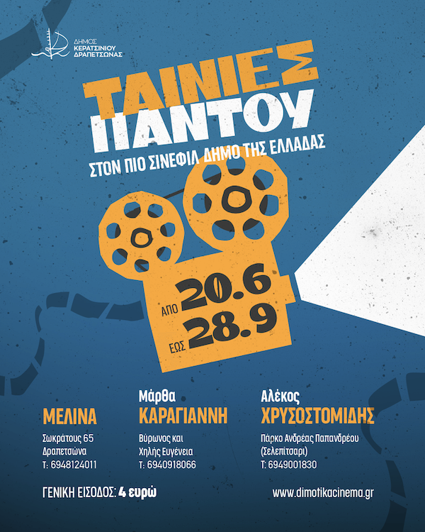 Για δέκατη συνεχόμενη χρονιά οι θερινοί δημοτικοί κινηματογράφοι του Δήμου Κερατσινίου-Δραπετσώνας μπαίνουν στον χάρτη τον θερινών μας απολαύσεων μ’ ένα πλούσιο πρόγραμμα ταινιών πρώτης προβολής. Την Παρασκευή 20 Ιουνίου 2025 κάνουν πρεμιέρα ο «κλασικός» ΜΕΛΙΝΑ στη Δραπετσώνα και ο «λαϊκός» ΜΑΡΘΑ ΚΑΡΑΓΙΑΝΝΗ στην Ευγένεια....