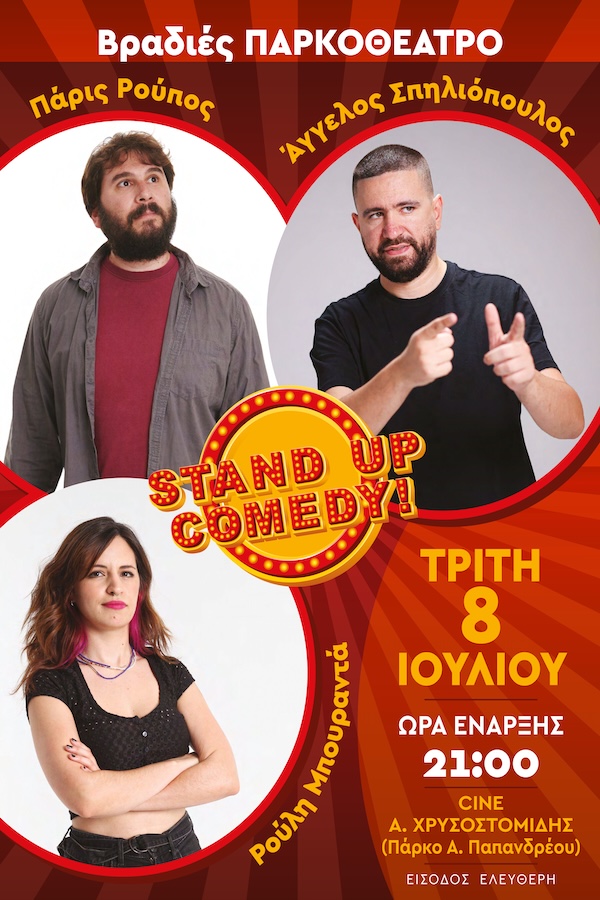 Τρεις κωμικοί με ξεχωριστό ύφος και αφοπλιστική αμεσότητα ανεβαίνουν στη σκηνή του Σινέ Αλέκος Χρυσοστομίδης, στο Πάρκο Ανδρέα Παπανδρέου στο Σελεπίτσαρι, για μια καλοκαιρινή stand up comedy βραδιά που υπόσχεται απενοχοποιημένο γέλιο, πικρές αλήθειες και καθαρές ματιές στην καθημερινότητα.