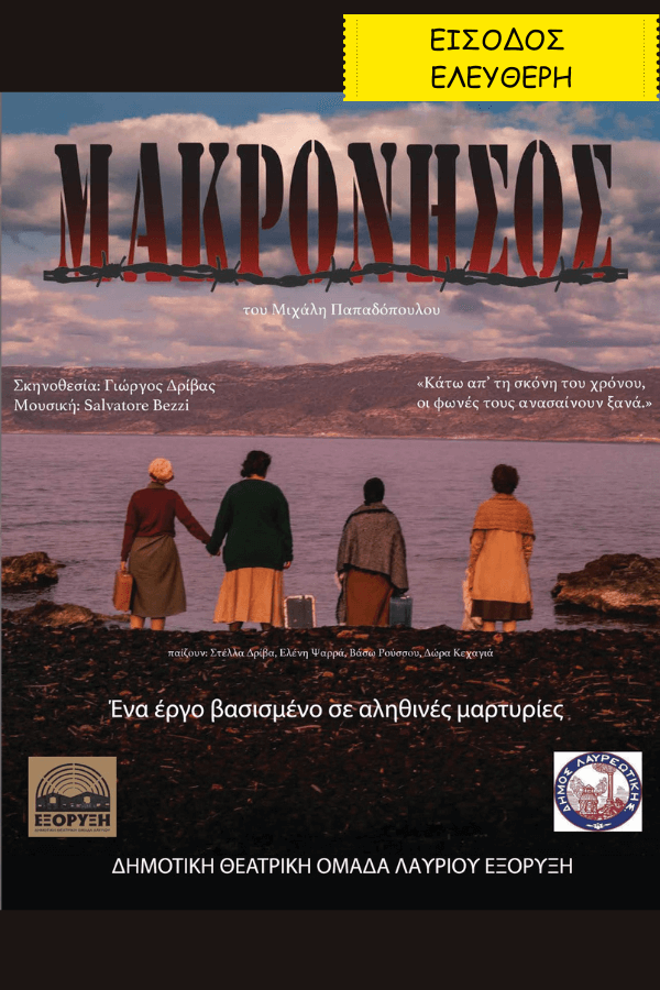 20 Ιούν Θεατρική παράσταση «Μακρόνησος» του Μιχάλη Παπαδόπουλου από τη δημοτική θεατρική ομάδα Λαυρίου ΕΞΟΡΥΞΗ